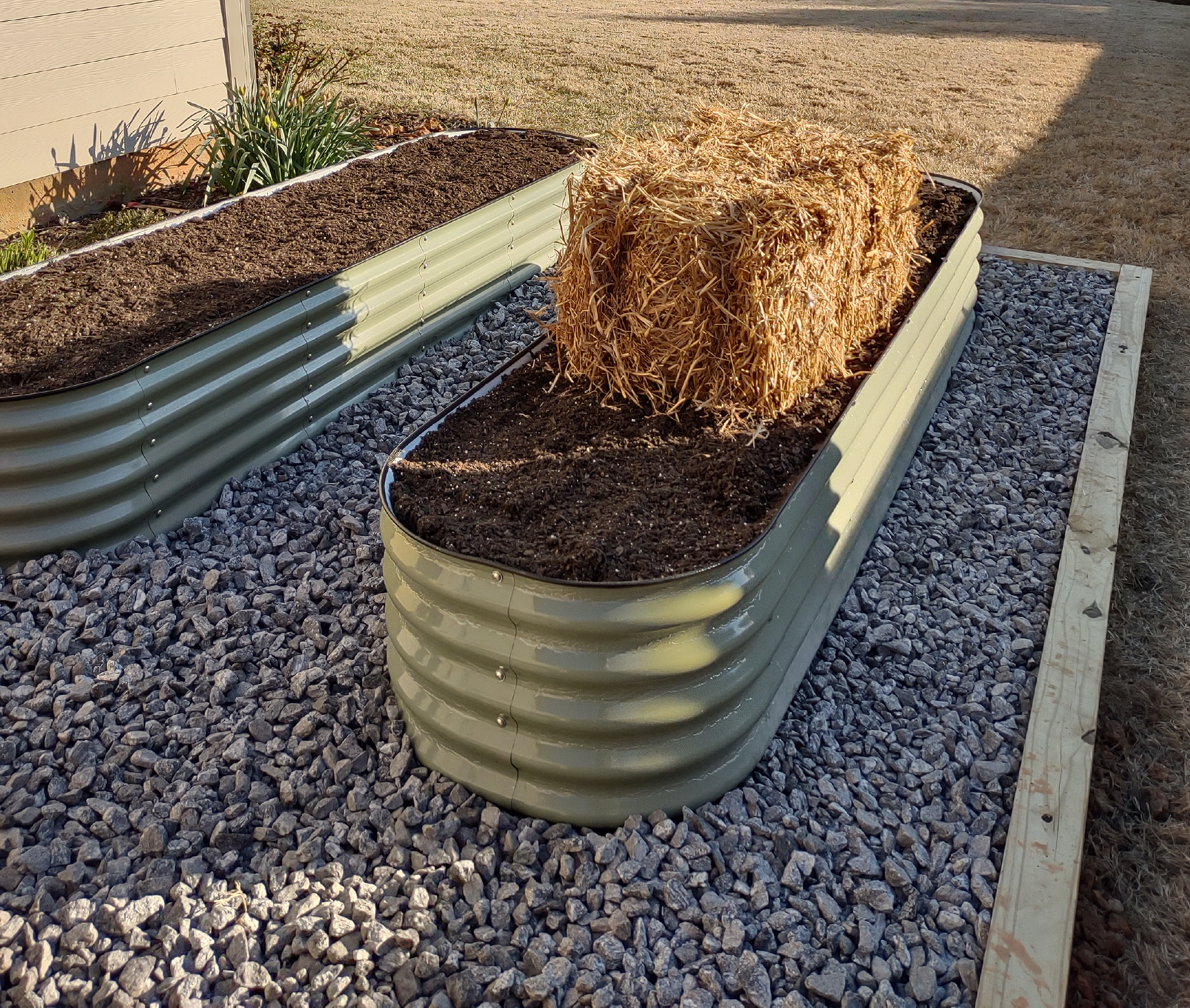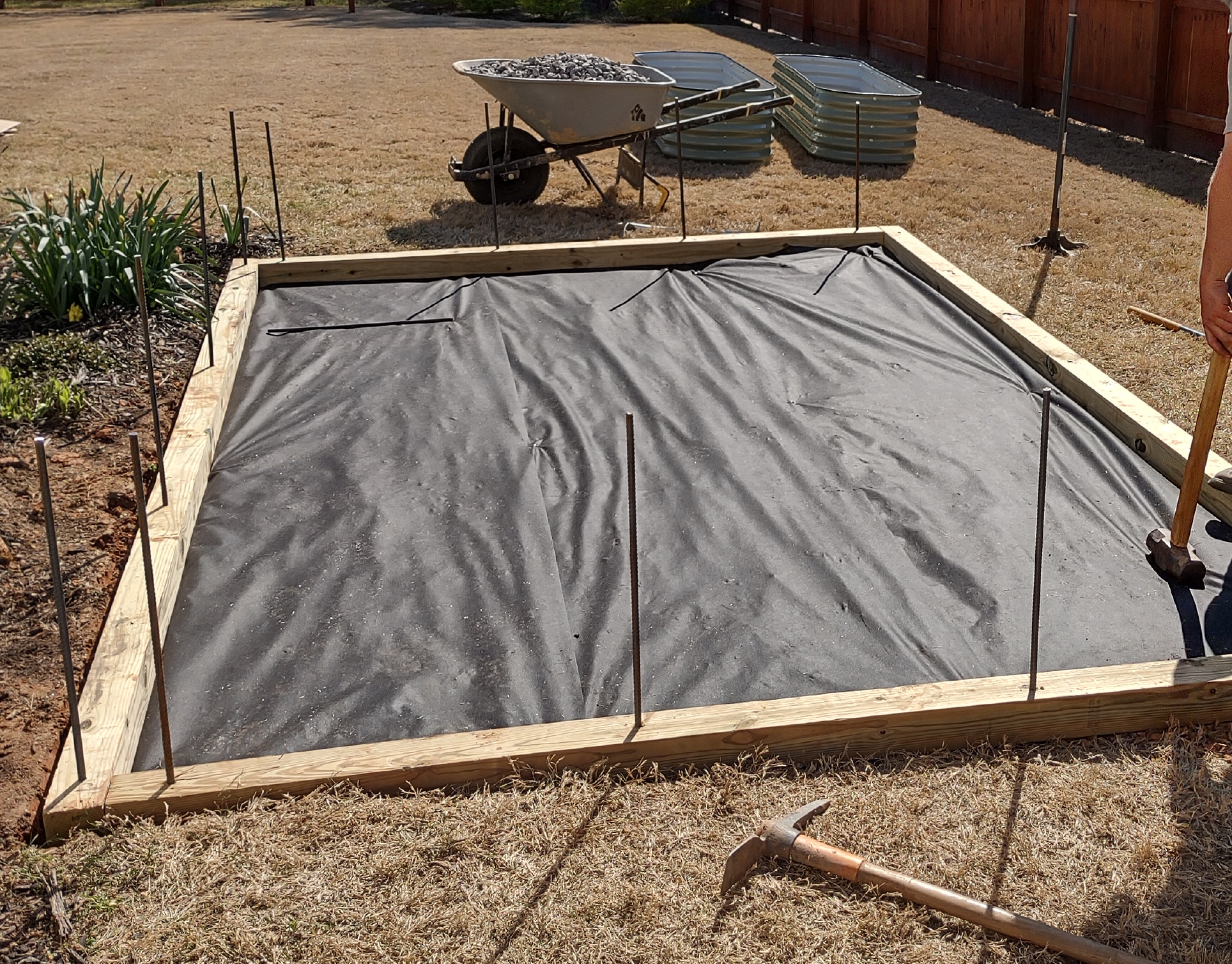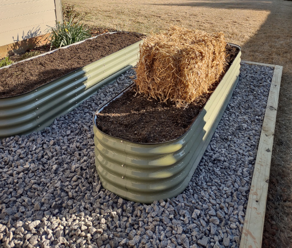 Installed two raised beds in area after leveling, framing, and filling with stone.